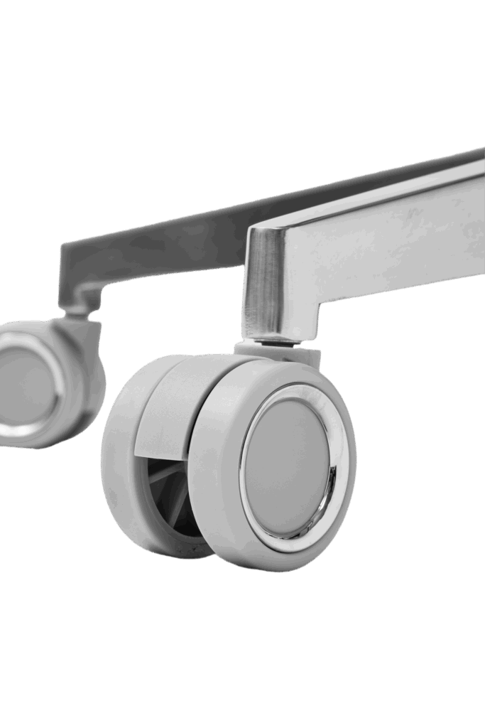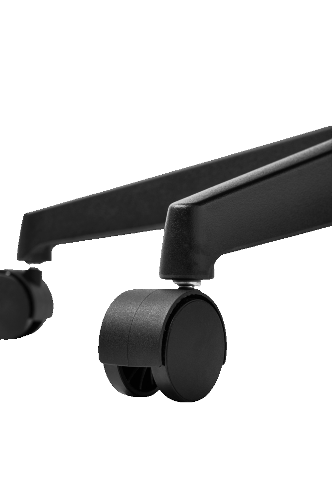 • Ciche i płynne kółka: Krzesło wyposażono w kółka typu „rollerblade”, które zapewniają wyjątkowo cichą i płynną jazdę po każdej powierzchni, bez jej zarysowania.